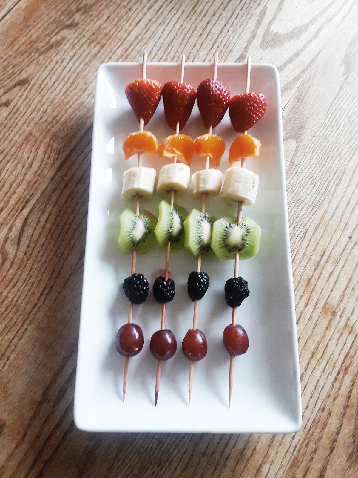 Red strawberries, oranges, yellow bananas, green kiwis, indigo blackberries and purple grapes.